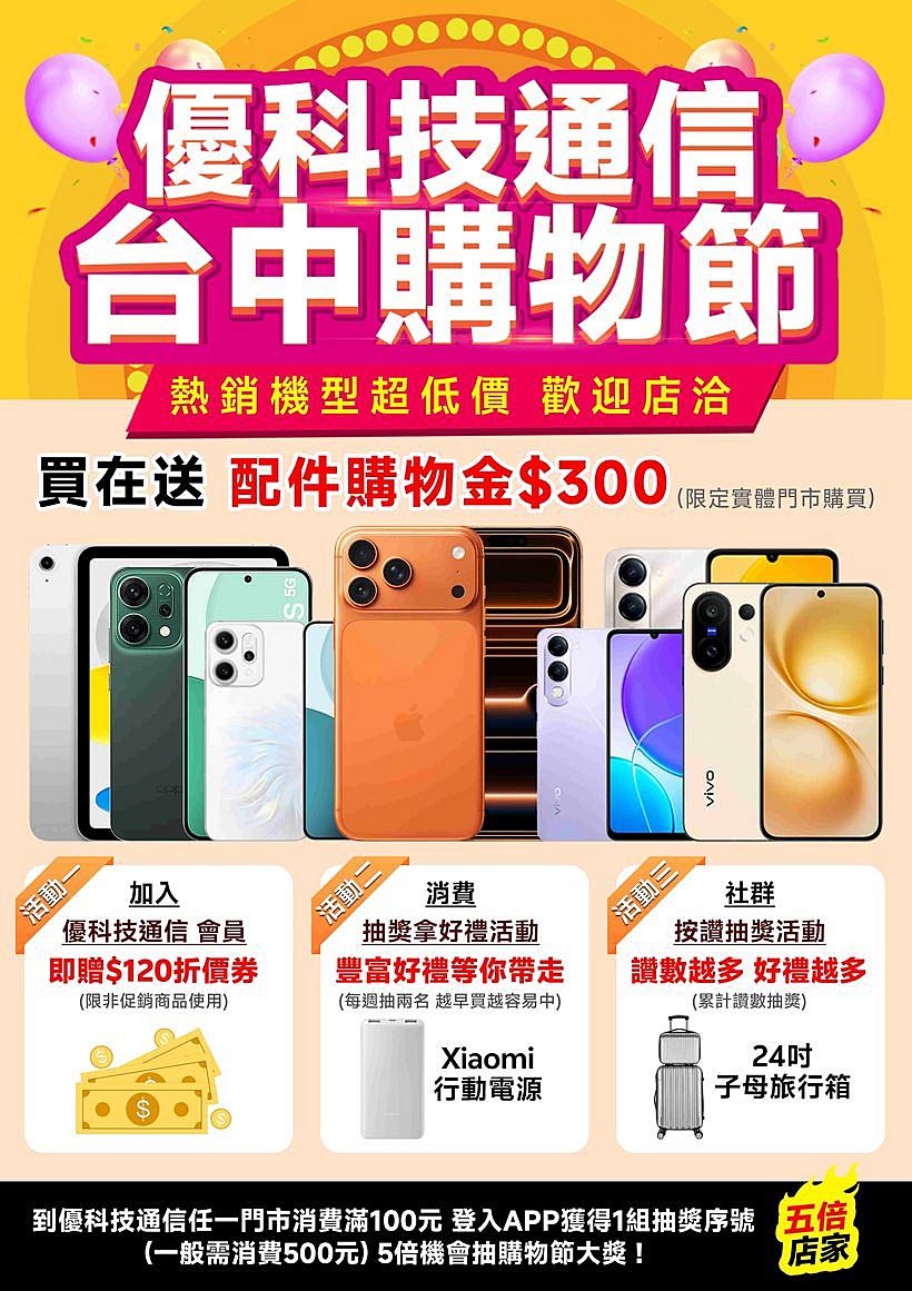 這不只是換機優惠,而是一場中「精品好宅」與「百萬豪車」的夢幻挑戰!只要在活動期間於優科技通信門市購機,就能以「五倍中獎機率」參加臺中購物節抽獎,用最划算的價格,搶進人生翻倍的機會!