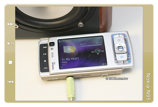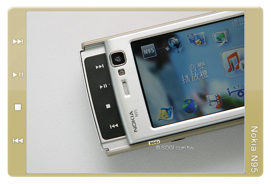 從 Nokia N95 的雙滑蓋設計上來看,可以輕易的得知它同時是一款支援強大的 MP3 音樂播放功能,不僅具備無線藍牙 A2DP 立體聲播放,還支援標準 3.5 mm 音源輸出孔的設計。至於在音質表現的部分,拜其雙 3D 立體聲喇叭,Nokia N95 的音質、音效非常立體,此外,玩家亦可透過手動的方式,幫 MP3 音樂在旋律的部分上加重或調整某些音場效果,加重音磁與音域上的深化表現。