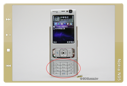 上圖是 Nokia N95 另一面的滑蓋機身展示圖,當上滑蓋往上推時,N95 與一般的滑蓋手機沒什麼差別,不過要特別注意的是,N95 內建的 GPS 接收器位於鍵盤底部,使用 GPS 導航時,需將鍵盤滑開,以便更容易接收來自天空的信號。