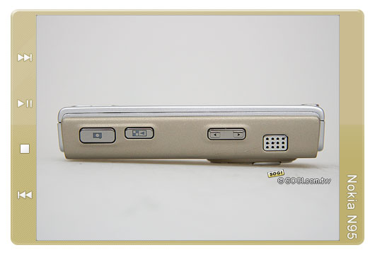 在機身側邊設計上,從 Nokia N95 的右側機身上可以發現其是一款以橫向拍攝操作模式為主的照相手機,機身上可明顯的發現拍攝快門鍵、數位變焦調整鍵與多媒體資料夾快速鍵。在拍攝操作上,Nokia N95 可說是一款集合簡單、快捷與人體工學設計的專業級照相手機。
