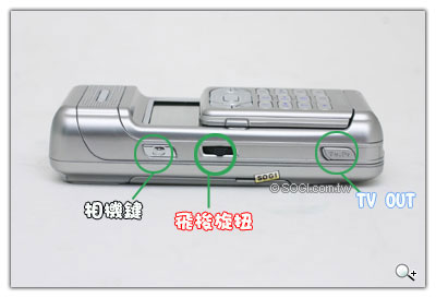 機身側面有三個功能鍵,相機鍵按一下可執行相機以及拍照時的快門鍵,中間的飛梭按鈕則是方面作閱讀或是功能選擇的最好的工具,獨特的 TV out 插孔 ,可以連接電視設備來播放,把拍出來的相片透過電視播放跟朋友們分享。
