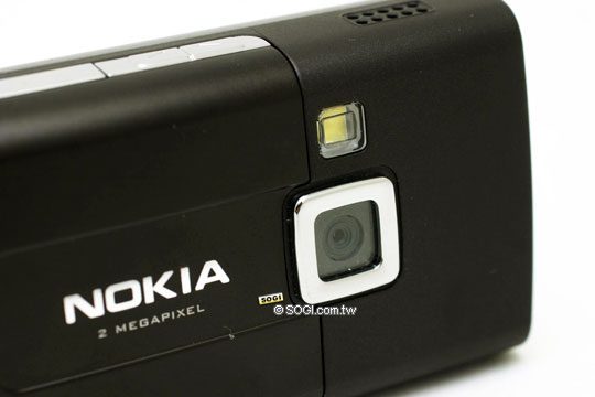 而下圖的背面相機設計,將 200 萬畫素的相機嵌在背蓋,旁邊是高亮度的 LED 補光燈,下面的 NOKIA 字樣則是品質與質感的象徵。畫面的上方也可以看到右邊立體聲揚聲器的輸出孔,它是 6270 的設計重點,也是它功能最佳演譯的角色。