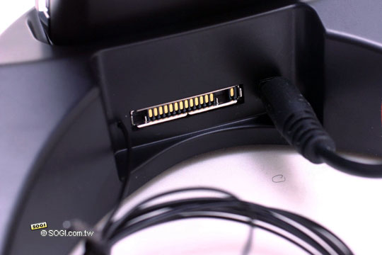 手機座後方的 Pop-Port 輸入埠,讓你可以連結 USB 傳輸線,如此放在手機座上也可以直接傳輸同步,因為手機上的 Pop-Port 輸入埠也只有一個,就是插上手機座裡了。而圖中底下有圓形的線圈,則是加強收訊的天線,讓廣播音質可以更佳。