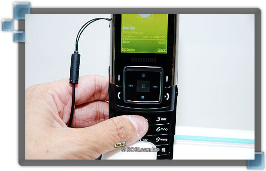 E950,最大的特色就在於感應區的部分,由原本的五方向按鍵改為可觸碰的 1.2 吋 OLED 螢幕,成為手機設計有史以來的奇觀,上下兩個螢幕互相呼應、操作。在平常的待機介面下,在四個方向預設了四個快捷功能鍵,分別為簡訊、通話紀錄、音樂和 Yahoo!快捷鍵,中間則是聯結網際網路。若是進入音樂播放功能,這個 OLED 螢幕的四個方向對應鍵,就會變成音樂手機常見的音樂播放鍵,如此創新的新式介面的確是三星的巧思。