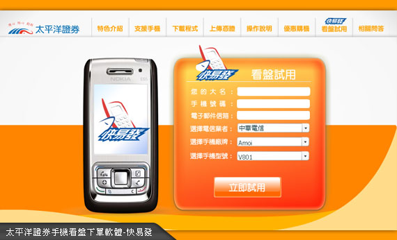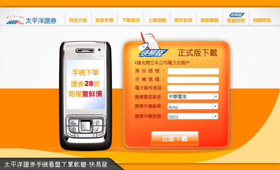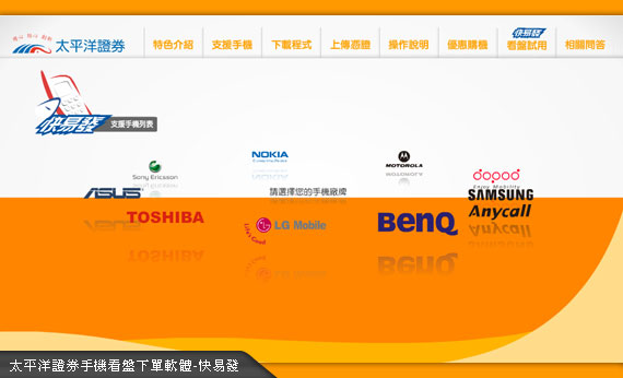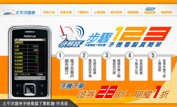 太平洋證券 所研發的快易發手機看盤下單軟體可提供市面上絕大部分手機品牌,舉凡 Nokia、Motorola、Samsung、LG、Sony Ericsson 等五大品牌,而 ASUS、BenQ、Dopod 等國產品牌亦有支援,以 Nokia 為例,除了 N 系列等 Symbian S60 智慧型手機之外,其他如 Nokia 5610 XpressMusic 等 S40 手機亦可支援,也就是說,太平洋證券快易發手機看盤下單軟體可以支援的手機款式上百款,人人都可以輕易的成為手機看盤下單高手。