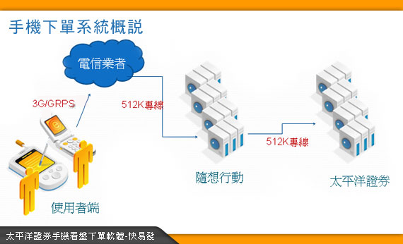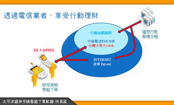 除了支援各種款式手機之外,太平洋證券快易發手機看盤下單 也支援目前各家電信業者,包括中華電信、台灣大哥大、遠傳電信與威寶電信用戶。外易發手機看盤下單 的運用原理非常簡單,用戶透過 3G 網路傳輸太平洋證券主機所提供的精準股票漲跌等各種資訊,流覽過後並選擇各股下單時,執行的指令也是透過 3G 網路傳輸至太平洋證券主機。目前,開立電子戶立即享有電子交易手續費證券 2.8 折及期貨、選擇權嚐鮮價!