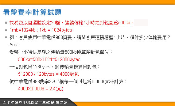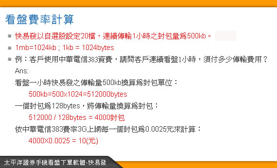 相信會有很多用戶擔心看盤下單連線時,在封包下載的費用上會過於驚人!別擔心,如上圖所示,以中華電信來說,383 資費連續看盤一小時僅需 10 元,983 資費一小時也才 2.4 元,資費越高越划算!