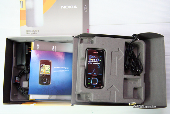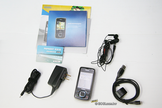 上圖為 Nokia 6210 Navigator 販售盒裝內所附的配件,共計手機一支、驅動光碟與說明書、充電器、2.5 mm 專用耳機、microUSB 傳輸線、1GB microSD 記憶卡 ( 直接插在手機內 ) 與上市初期所加贈的最新 PAPAGO! VR - ONE 導航軟體產品授權卡。