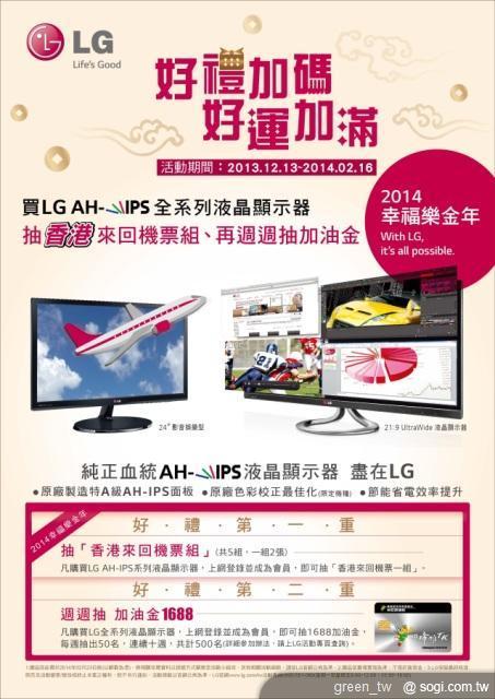 又到了歲末年終的季節,家家戶戶除舊佈新迎新年!LG 推出「好禮加碼好運加滿」活動,祝福大家新年好運旺旺來,凡於 2013 年 12 月 13 日至 2014 年 2 月 16 日購買指定家電(不含手機),買就送隨手杯乙組,或回函送 7-11 禮券;購買 CINEMA 3D 智慧型電視指定型號,回函送 LG G Pro Lite 手機乙台;另外,購買 LG AH-IPS 系列液晶顯示器,上網登錄並成為會員,即可抽「香港來回機票一組」(共五組,一組兩張),LG 好禮大方送,在新年即將到來的時刻,準備一系列優質好禮,陪您一起過好年。