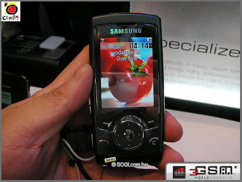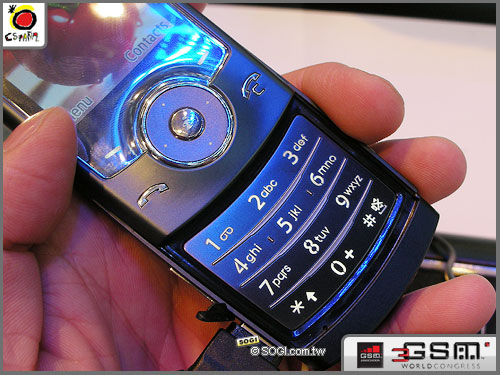 在 Samsung SGH-U600 這款超薄滑蓋手機上,可以簡單的發現幾項充滿時尚與精品設計的元素,如上圖,U600 在上滑蓋按鍵的設計上,採用圓弧曲線的線條區分各項功能鍵,再加上稍具反光效果的螢幕鏡面設計,在燈光下,U600 極容易吸引被注目的眼光。
