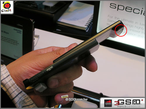 SAMSUNG SGH-U700 擁有超薄的 12.1 mm 機身厚度,在機身側邊處可清楚的看見其相機快捷鍵與所支援的 microSD 記憶卡擴充槽,而其本身內建的記憶空間則為 20MB。