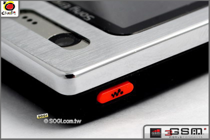 將 W810i 的 Walkman 選單快捷鍵機身左側上方,另外機側還有配置拍照快捷鍵、M2 記憶卡插槽以及耳機、充電兩用的 USB 埠;機背則有設計揚聲孔與 200 萬畫素數位相機鏡頭。