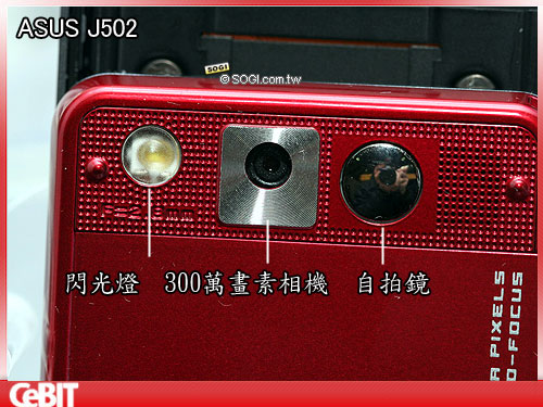 去年J501發表時,相機畫素為 200 萬,到了 J502 則提升到 300 萬,並且具備自動對焦功能,在拍照時可以大為加分;為了讓使用者快速操作,在機身側邊設有快速鍵。鏡頭旁除了有自拍鏡,還有閃光燈,不會因為暗處而拍出效果不優的照片。