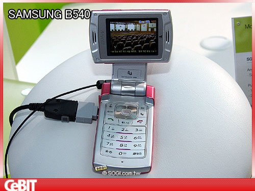 首先登場的是型號 Samsung SGH-B540,以品牌常見的折疊機身打造,而且 B540 的 2.15 吋 1600 萬色 TFT 螢幕,可由直向旋轉成橫向觀賞,有著與 16:9 寬螢幕電視同樣的視覺效果,希望給使用者充滿感官享受的高品質行動電視娛樂。Samsung SGH-B540 使用 Satellite-DMB 行動電視規格,在 CeBIT 會場更是強調,不管身在何處都能掌握電視節目的黃金時段。