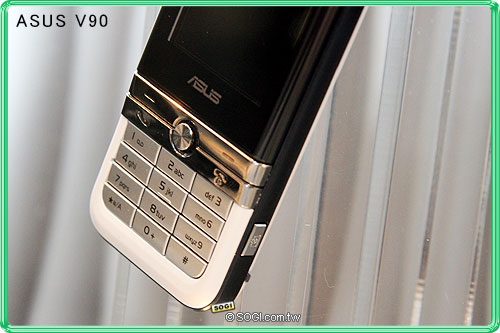 本次 Computex 唯一全新未曝光的手機,就是擁有 320 萬畫素自動對焦功能的超薄手機 ASUS V90。除了延續 V 系列的直立經典外型設計之外,超薄的 13.5 mm 機身厚度與時尚之外型設計,搭配 2 吋 26 萬色的 QVGA 螢幕,算是中階的優質手機。可惜的是,V90 仍屬於保密階段,本次展場中只在櫥窗中看到模型機,無法看到 V90 的螢幕和相機等多媒體性能。