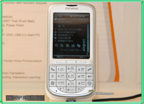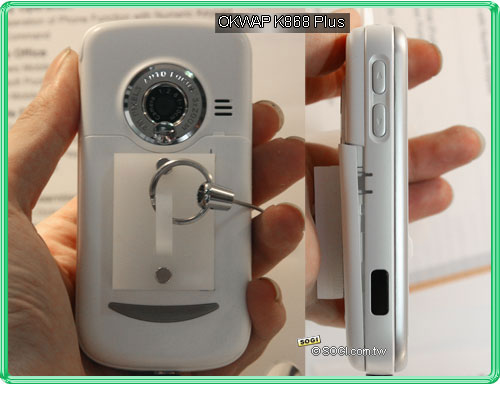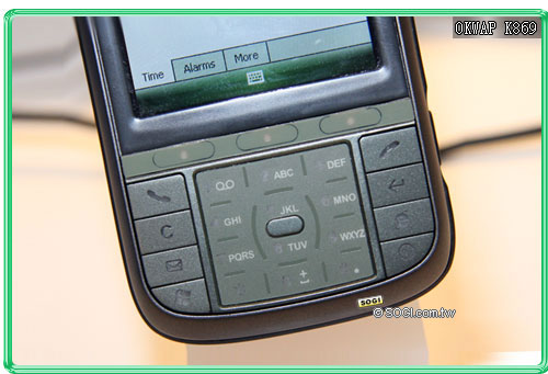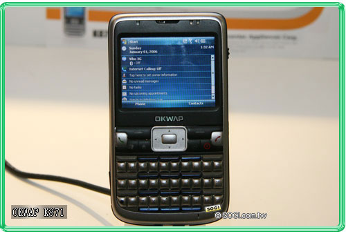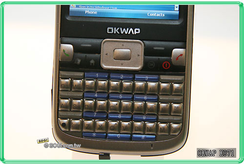 而 K871 則是 OKWAP 首款具備 QWERTY 鍵盤的 PDA 手機,更特別的是,不同於一般智慧型手機,K871 則是在鍵盤英文鍵當中,另外將數字按鍵獨立出來。在三排英文字母當中,插入了數字按鍵,使用者可以直接按壓撥打電話,無須再叫出虛擬數字鍵才能撥打電話。這樣獨特且友善的介面操作,可以給予初次使用 PDA Phone 的使用者更加人性化的操作選擇。