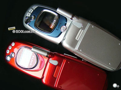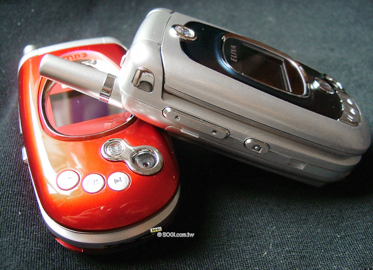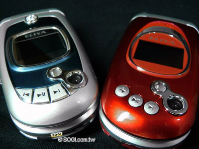 下圖左 ELIYA S601 與圖右 ELIYA S611內建的 30 萬畫素相機和閃光燈都在同一個位置,不同的差別在於 ELIYA S601 外螢幕上方鑲了一顆水鑽;且稜角設計的免翻蓋 MP3 快捷按鍵,與螢幕一體成型。左右的 ELIYA S611 設計較為秀氣, MP3 快捷按鍵圓形且立體設計的造型包括三種功能「啟動、播放、暫停」,與外螢幕頗有相互呼應之感,兩者外螢幕上,頗有同中求異的巧思。