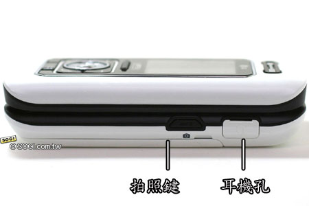 LG M6100 的手機右側面,有相機的拍照鍵和耳機插槽。令人矚目的是,M6100 隨機附贈原廠的線控耳機,可以操作播放、暫停、停止、前進及倒退等音樂控制,超值的配備令機迷大呼過癮!