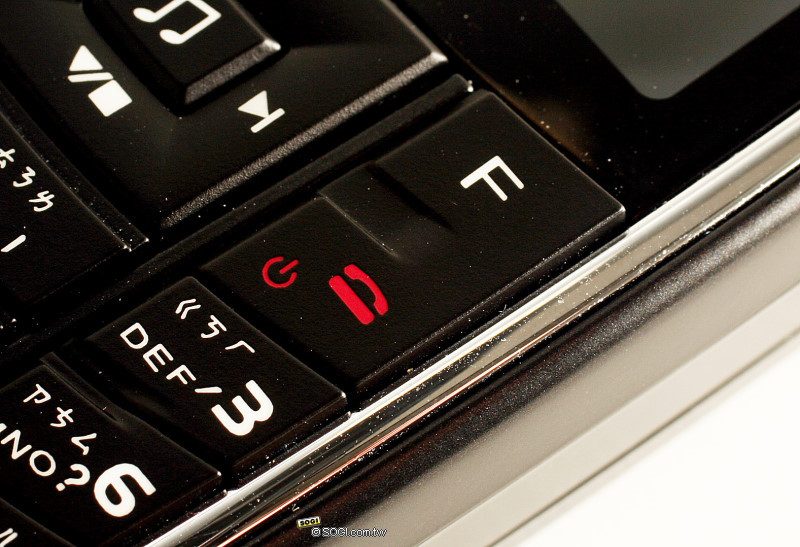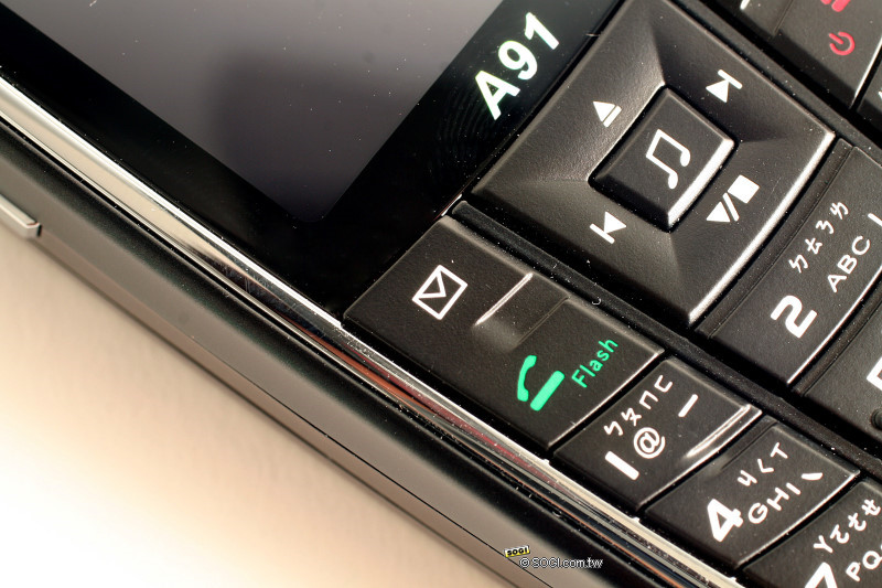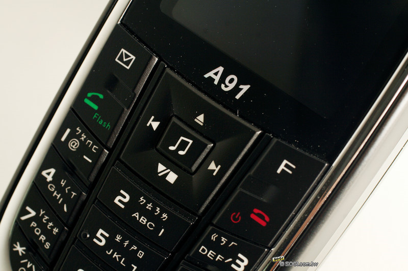 A91 螢幕下方設有許多快捷鍵,右邊「F」為 Menu 鍵、左邊「四」為訊息鍵、中央五項快捷鍵則掌管不同功能:中央音樂符號鍵可啟動 MP3 及 FM Radio 功能、上下左右則依序可查詢已撥電話、來電紀錄、行事曆、電話簿等資訊。