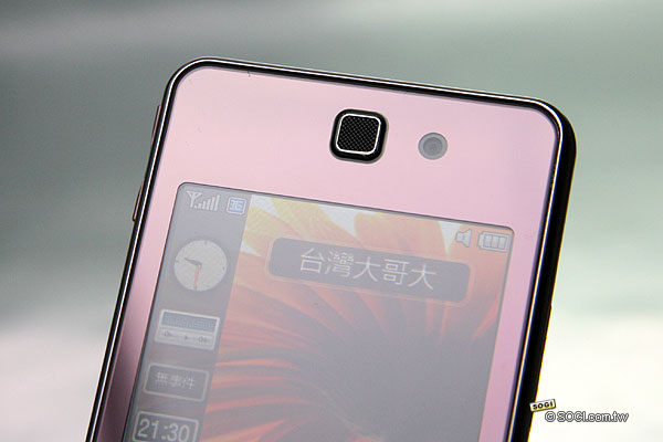 ▲ 正面為粉紅色的鏡面處理,聽筒為網狀設計、旁邊是視訊通話鏡頭。