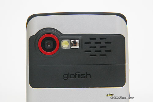 在機身背面,可以看到 glofiish X800 的 200 萬畫素自動對焦相機鏡頭,旁邊並設有閃光燈與自拍鏡,除此之外,X800 的喇叭揚聲器亦置於機身背面。