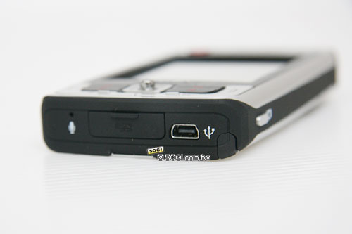 在機身底端,ETEN glofiish X800 具備 micro SD 記憶卡擴充插槽,隨機將附贈一張內含 PaPaGo! 與 M-Stock 軟體的 1GB 記憶卡,在記憶卡插槽旁邊則是 mini USB 傳輸插孔,此外,X800 的觸控筆插槽位置亦位於此處,包裝內還會多附消費者一隻觸控筆。