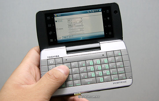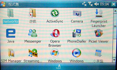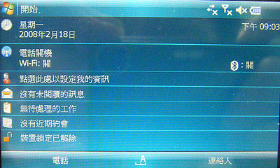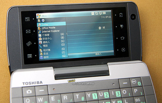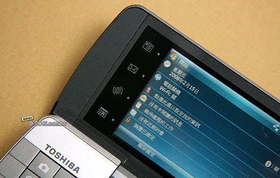日系品牌果然有發揮其優勢,G910 就採用了日系手機高階款必備的 3 吋 WVGA 螢幕,解析度高達了 480 x 800 pixels,目前在 PDA 手機中屬於相當高檔的螢幕。仔細看螢幕上的內容,G910 已經完成一部份的中文化,雖然進入程式集當中仍有部分英文介面,不過 Toshiba 表示 G910 中文版的上市版軟體很快就會完成。