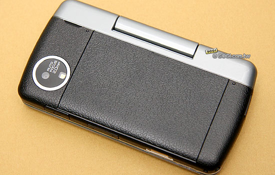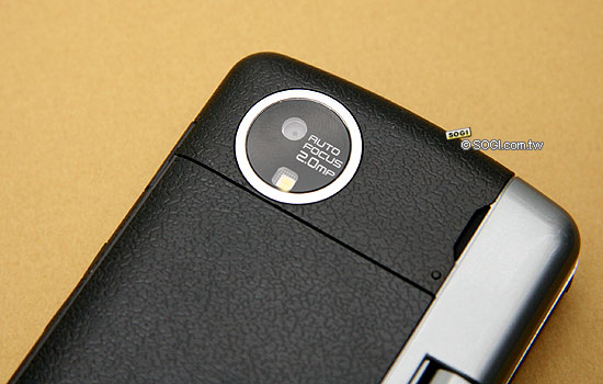 背面的設計又是一陣驚訝,和正面的觸感完全不同,是以仿皮格的塑膠材質來塗裝,這種材質放在桌上應該比較不容易磨損,觸感也還可以接受。另外,背面也裝了一顆 200 萬畫素的自動對焦鏡頭,改善 G500、G900 沒有 AF 的缺點。