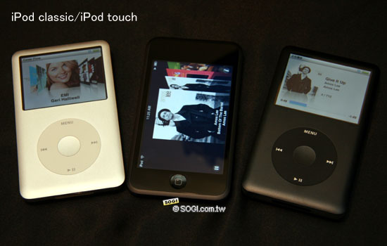 iPod classic 是人氣不墬的經典長賣款,現在的 classic 算是這系列的第六代了。容量上從 30G/60G 升級為 80G/160G,160G 版本最高可儲存 40,000 首音樂和 200 小時的影片。新一代的 iPod classic 採用電鍍鋁質與拋光不鏽鋼外殼,提供黑色和銀色作為選擇,在正面的部份較不容易留下指紋,操作的時候不用再小心翼翼的。