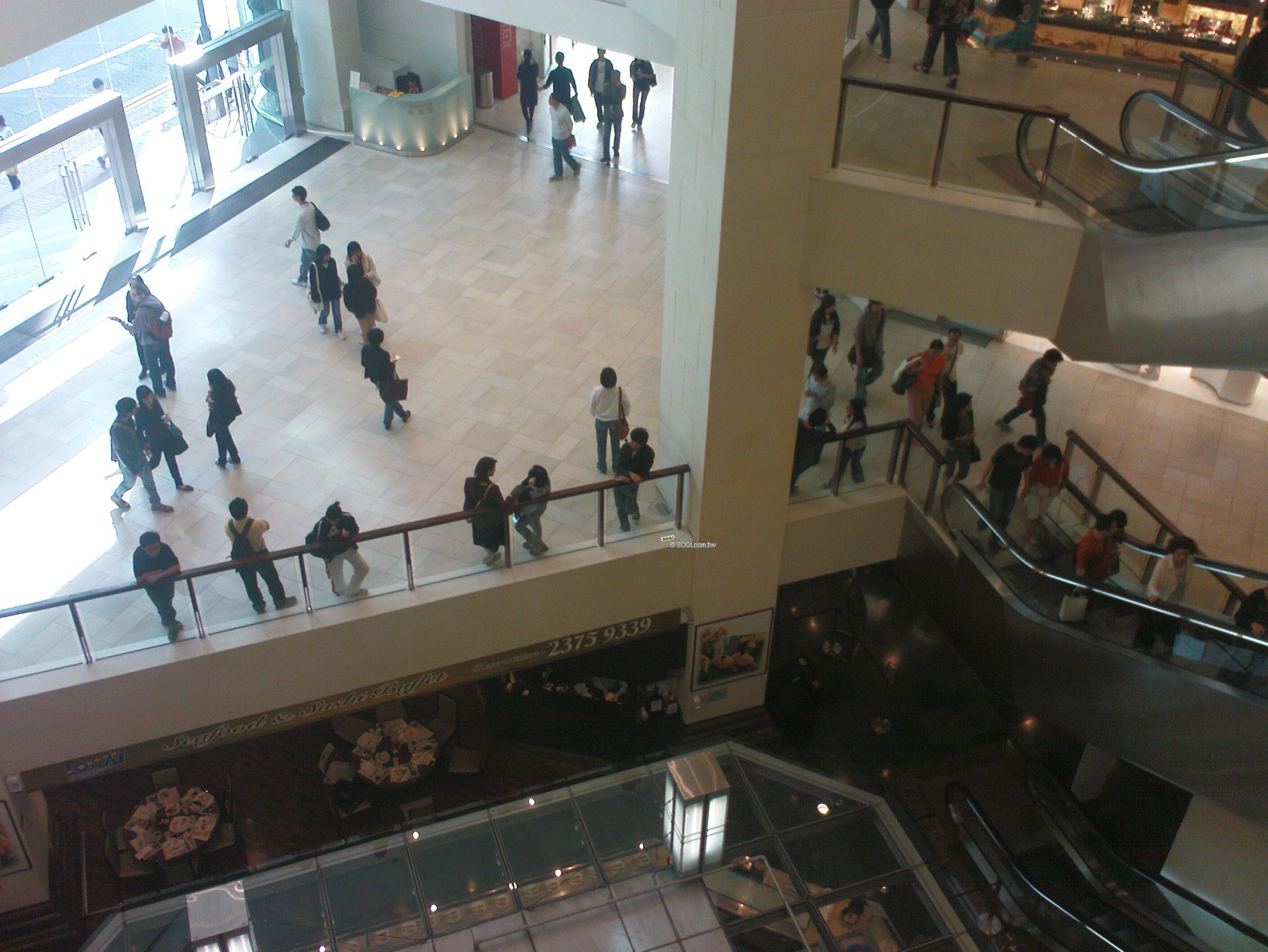 商場內部拍攝的照片,首先靠近大門的部分,有點過度曝光。右邊手扶梯的人物又顯得稍暗而且模糊。最好的部分在中央下方的玻璃屋頂,清晰、明亮、粒子適中,所以在室內拍攝得慎選場合與角度,盡量避免光源混雜的場景。
