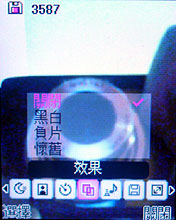 LG U8500 的拍照介面如上,在追求高畫素的同時,能夠吸引消費者的,是更多元的拍照功能和細膩的畫質。U8500 可以用全螢幕來取景拍照,內建了特效模式、閃光燈、相片框、白平衡、等實用拍照功能。