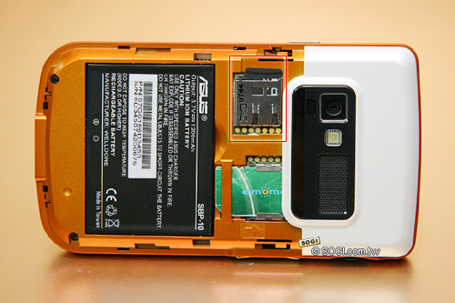 打開背面電池蓋,可以看到 ASUS M530w 的 microSD 記憶卡擴充插槽 ( 上圖紅框處 ),根據官方數據,M530w 最大可支援至 2GB 的記憶卡容量。