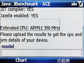 ARM 與 JBenchmark 合作開發的測試程式「ARM CPU Estimator(ACE)」,可測試手機的處理器與 Java 效能,以及 CPU 資訊以及圖表。測試的方法非常簡單,只要將 ACE 程式傳到手機或記憶卡當中,打開程式在手機上安裝即可。安裝完成後,打開 ACE 應用程式檔案並執行,即可就可以看到如 CPU Family、時脈與 Java 效能圖表等資訊。結果顯示,ASUS M530w 屬於 ARM11 系列,執行時脈為 390MHz,支援 Jazelle 硬體 Java 加速。