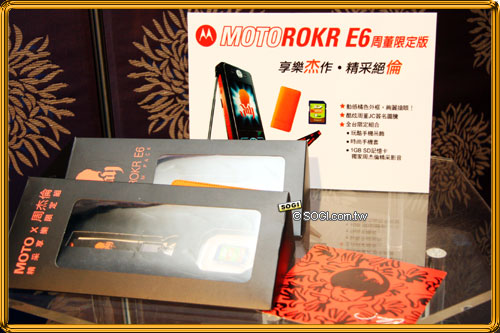 「MOTOROKR E6 周杰倫限定版」擁有奪目搶眼的橙色外框,機身背面還有 JC 標誌,另外還加贈玩酷手機吊飾、時尚手機套及已預載周杰倫 MP3 音樂鈴聲及酷炫桌布的 1GB SD 記憶卡,「MOTOROKR E6 周杰倫限定版」絕對是喜歡周杰倫的粉絲和酷炫一族絕對不能錯過的音樂聖品。