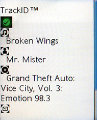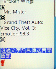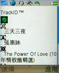 SE W660i 支援 TrackID 音樂辨識功能,小編正好在收聽 FM 廣播,馬上試用這個功能,廣播上播放的歌曲經過取樣之後,立即傳送至 Gracenote Mobile MusicID 資料庫,經過不到數秒鐘就立刻回傳了識別的結果,如下圖包括專輯名稱、歌手姓名、以及歌曲名稱,不論是中文或英文歌、辨識的速度極佳。