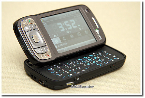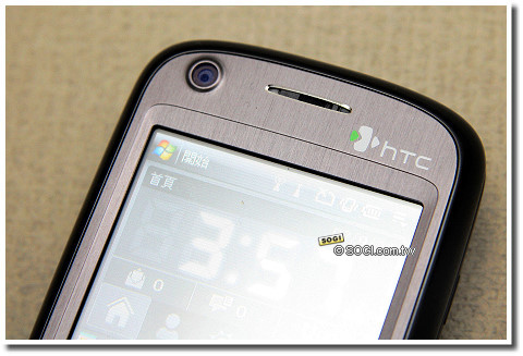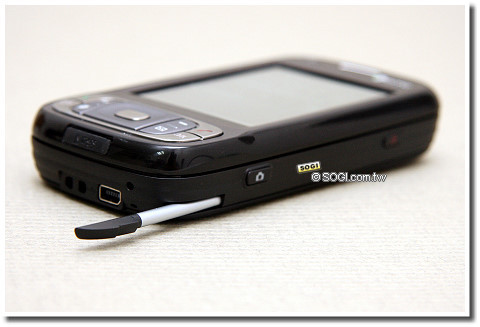 機身右側也相當簡單,僅有電源鍵與相機快門鍵,不過值得注意的是機底部份,除了傳統觸控筆插槽,HTC 獨家的耳機、傳輸及充電傳輸埠(相容於miniUSB),另外 microSD 擴充槽被設在上蓋的底部,則是與先前產品較為不同的地方,不過 microSD 也支援 SD2.0 的 SDHC 格式,目前最高可支援至 4GB 容量。