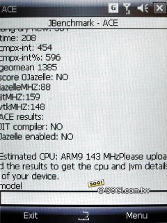 ARM 與 JBenchmark 合作開發的測試程式「ARM CPU Estimator(ACE)」,可測試手機的處理器與 Java 效能,以及 CPU 資訊以及圖表。測試的方法非常簡單,只要將 ACE 程式傳到手機或記憶卡當中,打開程式在手機上安裝即可。安裝完成後,打開 ACE 應用程式檔案並執行,即可就可以看到如 CPU Family、時脈與 Java 效能圖表等資訊。結果顯示,HTC TyTN II 屬於 ARM9 系列,執行時脈為 143MHz,不支援 Jazelle 硬體 Java 加速。