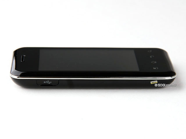 ▲LG Optimus Chic E720 機身左側面配置帶有保護蓋設計的 microUSB 插槽,不但有效避免灰塵侵入,也讓外型更趨一致性。