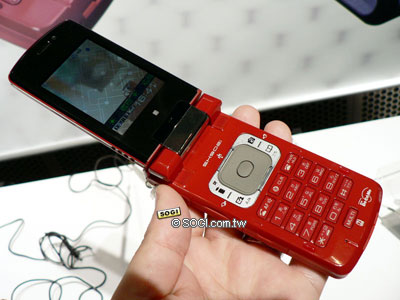 由三菱電機製造的 D902i,應該是這次最有特色的一款了。延續 D901i、D901iS 的滑蓋式設計,加長的寬螢幕,2.8 吋、解析度 240 x 400 pixels,超大的螢幕可以顯示大量的文字資訊,而且螢幕還可以劃分成上下兩部份,用以閱覽電話簿和行事曆的資料。甚至,收發 email 和看影片的時候,還能切換成橫式螢幕瀏覽。最厲害的設計在於,D902i 有這麼大的螢幕,手機的厚度只有 1.9 公分。
