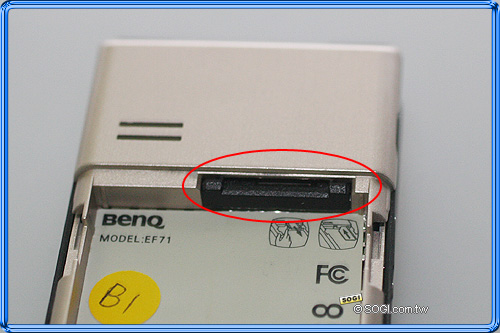 BenQ-Siemens EF71 內建 24MB 記憶空間,並可擴充 microSD 記憶卡功能,最高可擴充高達 1GB 的容量,記憶卡插槽位置則必須打開背蓋才可進行更換 ( 上圖紅圈處 )。