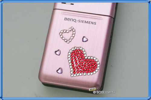 此外,BenQ 還針對這二款不同色系風格的 EF71,分別設計不同的專屬配件。粉紅 BenQ-Siemens EF71 在專屬配件上,比較符合女性消費族群,共計有粉亮手機套 ( 亦可充當零錢小皮包來使用 )、粉色心型手機吊飾 ( 附有二顆不同大小的紅、白水晶球 ),此外,消費者還可在粉紅 EF71 機身上黏貼水晶貼紙,更添加個人風采。