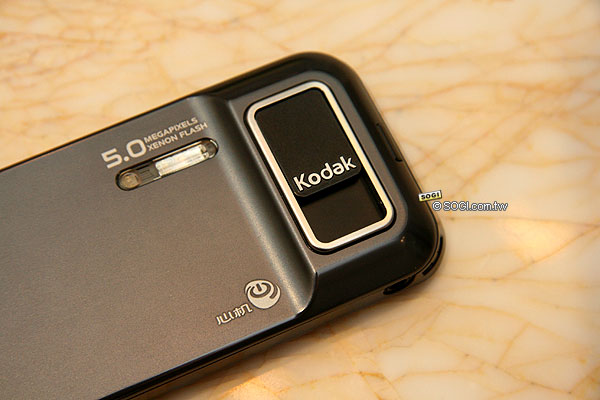 而 MOTOZINE ZN5 的背面設計很 DC,鏡頭的部份比較靠近手機頂端,雖然官方給的尺寸資料是 117.9 x 50.9 x 11.8mm,但鏡頭的部份有明顯凸出來,厚度就稍微增加了一些,約為 2~3mm 左右。還好這個容易磨損到桌子的部份,採用了滑蓋鏡頭的設計,可以把鏡頭好好保護。在鏡頭蓋上的 Kodak 大字,高調的要證明兩家美國品牌的合作關係。