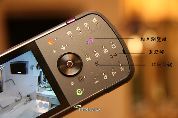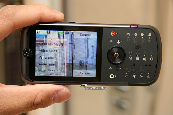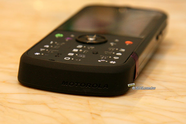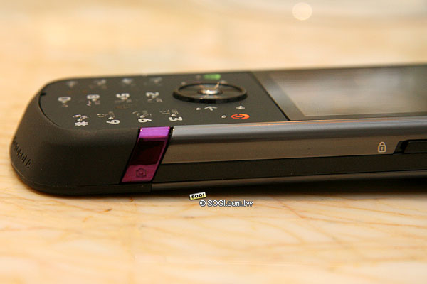 就如同先前流出的照片一樣,MOTOZINE ZN5 採用直立式的雙面設計,正面的部份由 2.4 吋的螢幕和全平面的按鍵,各佔了一半的面積。按鍵為 Mode Shift 的觸控式虛擬按鍵,有幾個按鍵是在相機介面才會亮燈的,不過就算按鍵燈沒亮都能看的到。從下圖中,除了左右對應鍵、撥出和掛斷鍵之外,還有顆紫色的虛擬觸碰鍵,可以在一般模式下直接瀏覽照片,特別以紫色按鍵燈來突顯。