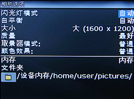 開啟相機之後,按下軌跡球左邊的功能鍵,即可呼叫相機相關的拍攝設定,如上圖,BlackBerry Curve 8300 支援白平衡與顏色特效,使用者還可調整最大 1600 x 1200 pixels 大小的影像,當然也包含全螢幕模式拍攝。