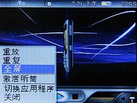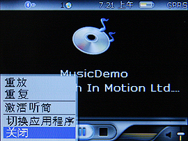 BlackBerry Curve 8300 亦內建 MP3 音樂與影片播放器,如上圖,在音樂播放的部分,使用者還可設定重複播放,而影片播放部分,則可設定全螢幕播放,此外,這兩項播放器皆具備「聽筒播放」設定 ( 激活聽筒 ),也就是說,使用者可以將音質輸出孔由喇叭移轉至聽筒上,如果忘記帶耳機出門的話,則可避免吵到週遭的人士。