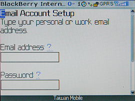 首先,先開啟主功能表上的「E-mail Settings」,此時螢幕畫面將自動導向設定畫面,使用者只要輸入電子郵件帳號與密碼,按確定之後,黑莓機便會自動為您設定郵件收發帳號。