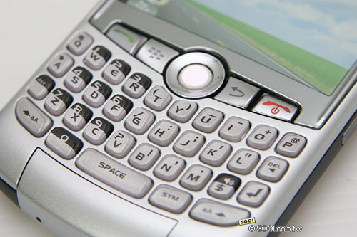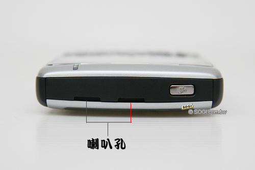 在頂端的部分,可看到 BlackBerry Curve 8300 的喇叭孔與靜音快捷鍵,該鍵的功能在於,當正在開會時,當有來電,按下此鍵則可快速消音切入靜音模式。