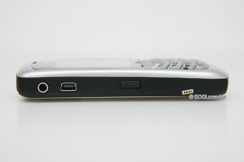 在另一側邊,BlackBerry Curve 8300 亦具備三項設計,由左而右分別是 3.5 mm 耳機插孔、USB 傳輸孔與語音撥號快捷鍵。