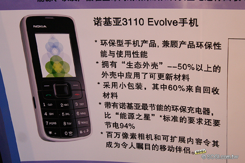在其他環保議題上,諾基亞專題演講中表示,諾基亞除了公佈環保手機 Nokia 3110 Evolve 之外,諾基亞手機亦特別具備充電提示功能,透過此提示功能,用戶可在充完電之後適時的拔下手機電源線,而此舉亦可成功的省下約 10 萬用戶的用電規模﹔除此之外,諸如廢棄手機、廢棄電池等回收工作,也著實的在諾基亞綠箱子環保計畫中持續的進行。