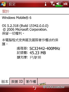 由於採用了 Windows Mobile 6 Professional 作業系統,加上 VGA 等級的螢幕表現,所以從 X500+ 截圖畫面可以看出,比起先前 X500 具有更細緻的螢幕效果,而在系統資訊中,也可以明顯的看到使用的作業系統是 Windows Mobil 6 版本,而硬體部份的 CPU 速度及 RAM 與 ROM 的容量,仍維持 X500 的 SAMSUNG 400Mhz 處理器與 64MB RAM/128MB ROM 的設計。